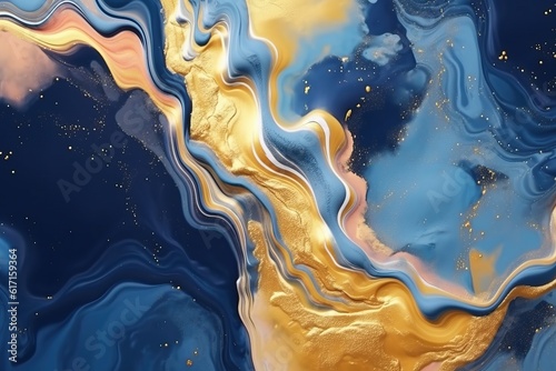 Fluid macro art texture. Backdrop with abstract mixing paint effect. Liquid acrylic artwork that flows and splashes. Mixed paints for interior poster. Blue, gold and white colors