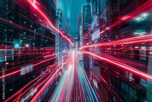Fluorescent red and cyan light trails weaving through a dense, futuristic metropolis, Generative AI
