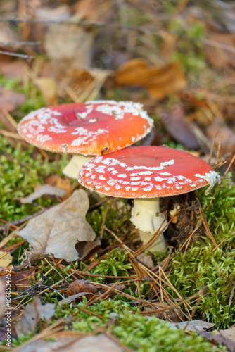 Fly agaric in the forest close-up. A poisonous and dangerous mushroom grows in the forest.