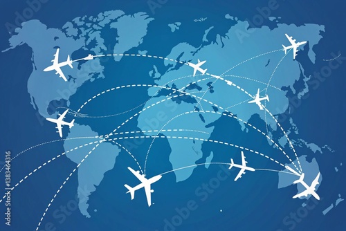 Flying airplanes world map abstract vector background - flying white airplanes routes on blue background-generated by ai