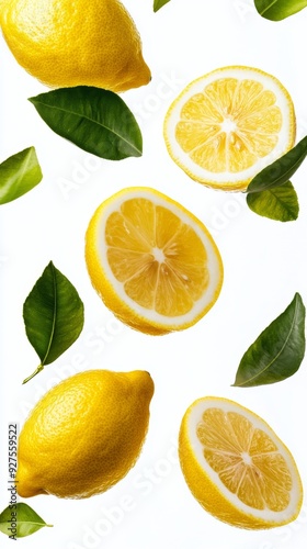 Flying fresh raw whole and sliced lemons with leaves on white background
