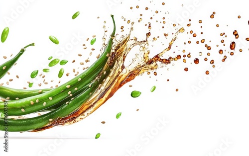 Flying green beans with sesame seeds and soy sauce splashes, healthy and dynamic, isolated on white background