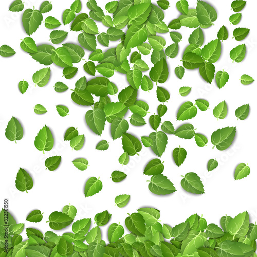 Flying green leaves on white background. Spring leaf pattern on isolated backdrop. Fall fresh leaves plant. Vector illustration