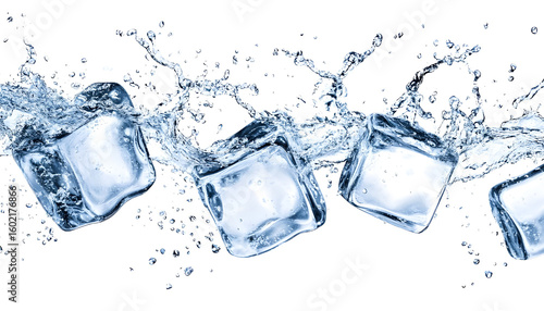 flying ice cubes with water splashes isolated on white background