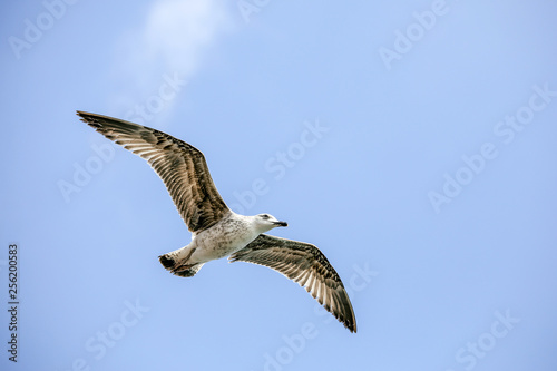 Flying lesser black backed sea gull bird with open wings during flight in front of blue sky with clouds