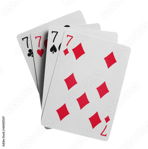Flying playing card for poker and gambling, four seven isolated on white, clipping path