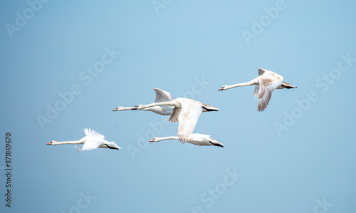 Flying swans in the blue sky. Waterfowl at the nesting site. A flock of swans walks on a blue lake.