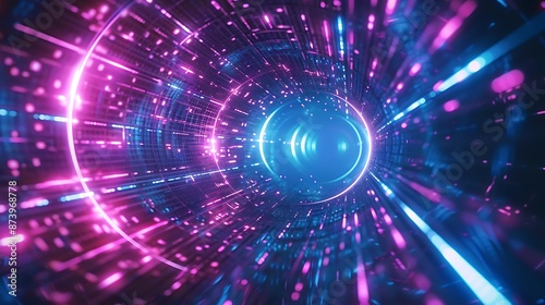 Flying through an endless luminous celindric tunnel design with neon luminous particles