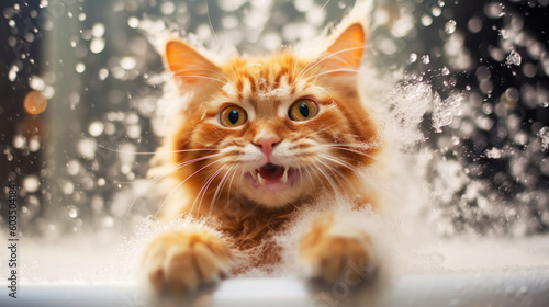 Foam bubbles are flying around a funny cat. An active ginger cat is happy to bathe in the bathtub with foam in the grooming salon. Animal Hygiene and pet care concept. Banner. Generative AI