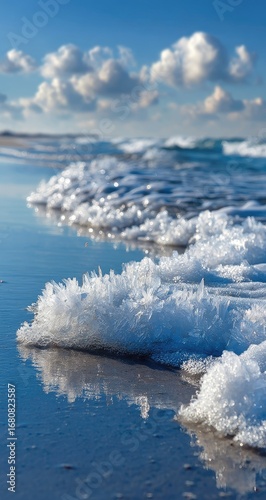 Foamy waves on a beach, vibrant blue water, and a partly cloudy sky