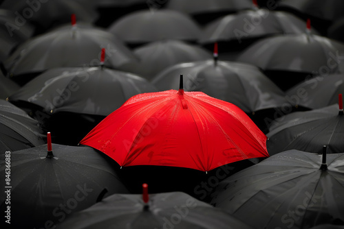 Focus on a Red umbrella alone among a crowd of black umbrellas on a rainy day, concept of identity and difference, of being unique among others