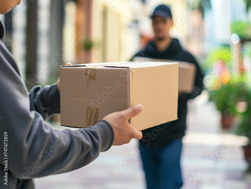 Focus on passing a package from one person to another outdoors in an urban environment.