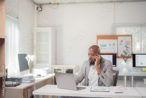 Focused African American businessman multitasking with a laptop and phone call, showcasing efficiency and productivity in a modern office environment