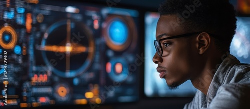 Focused African American Engineer Designs Rockets on Multi-Screen Display, Aerospace Mission Control