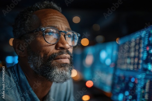 Focused African American IT Professional Analyzing Data on Multiple Computer Screens, ensuring cybersecurity and data integrity with advanced software systems.