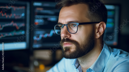 Focused Analyst: A pensive, bearded man wearing glasses intently studies financial data displayed on multiple computer screens, illuminated by the soft glow of the monitors in a dimly lit office.