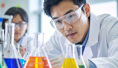 Focused Asian scientists conduct chemical experiments in a modern lab.