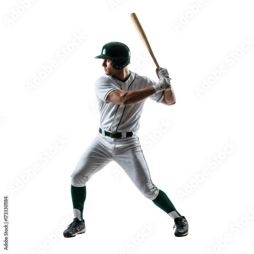 Focused athlete poised to swing with bat against simple studio background, strength and