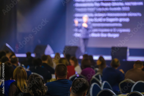 Focused audience members attentively listen to a keynote speech during a professional conference.