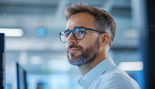 Focused Auditor Reviewing Computer Screen for Audit Trails and Data Validation in Modern Office Environment