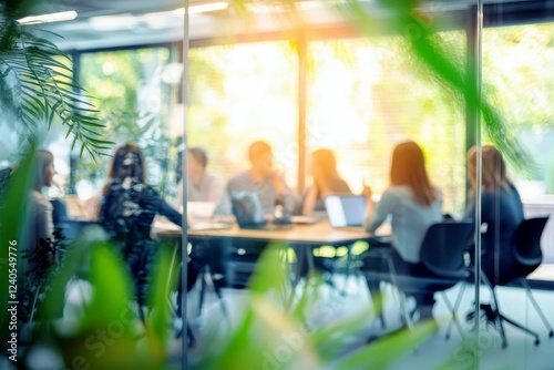 Focused business meeting in modern office with greenery and blurred participants collaborating on strategy and ideas in bright workspace