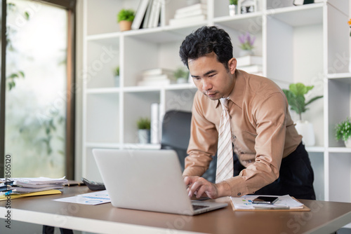 Focused business professional working on laptop in modern office environment productivity technology contemporary workspace