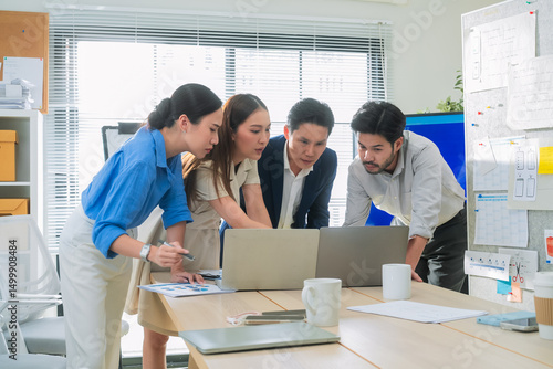 Focused business strategists stand head-to-head in a modern office, concentrating on agile planning and financial structure, using AI to forecast results and align team goals for success business team