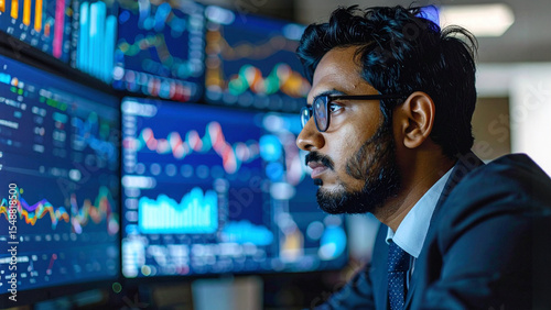 Focused businessman analyzing financial data on multiple computer screens. He is wearing glasses and a suit, and the screens display graphs and charts