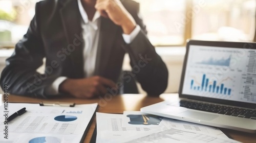 Focused businessman at desk with financial documents and laptop displaying earnings reports, conveying determination and attention to financial data analysis.