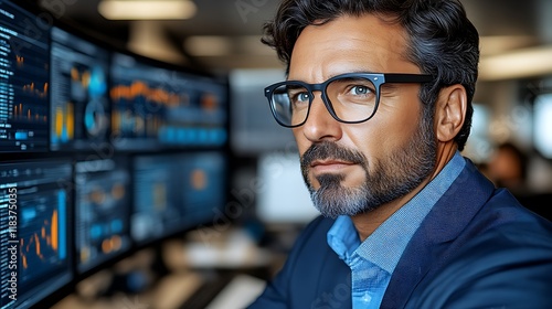 Focused Businessman: Data Analysis, Serious Mood, Modern Office