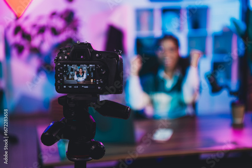 Focused camera capturing young female blogger in colorful studio setting surrounded by equipment for professional content creation