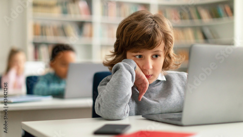 Focused caucasian schoolboy sitting at desk and using laptop computer in an elementary school classroom