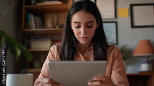 Focused Concentration: A young woman in a serene office environment, engrossed in her tablet, conveying a sense of deep concentration and dedication to her work.