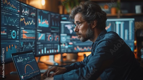 Focused Data Analyst Analyzing Financial Trends on Multiple Monitors in a Modern Workspace. Generative AI