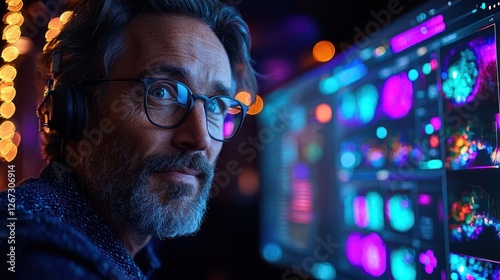 Focused Data Scientist at Night, Analyzing Complex Neural Network Data on Monitor