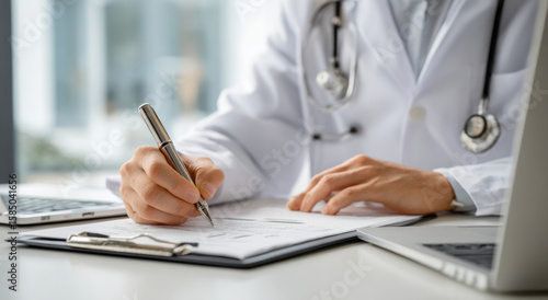 Focused doctor writing medical prescription on clipboard at clinic desk