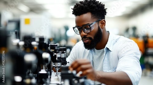 Focused engineer working on precision machinery in a modern laboratory setting. Black History Month