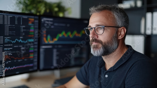 Focused financial analyst reviewing data on multiple screens, analyzing trends and performance