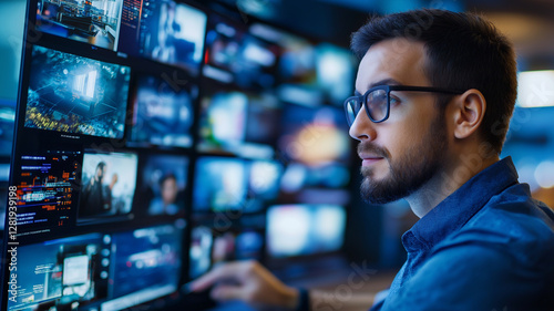 focused individual interacts with wall of digital screens displaying various data and visuals, showcasing technology and information analysis