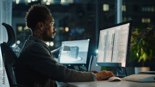 Focused male professional analyzes data on a multiscreen computer setup at night.