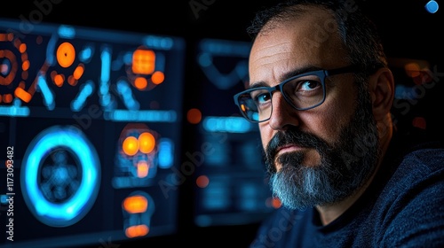 Focused Male Professional Surrounded by Modern Technology and Data Displays