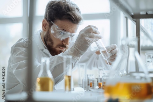 Focused male scientist analyzing test tube in lab