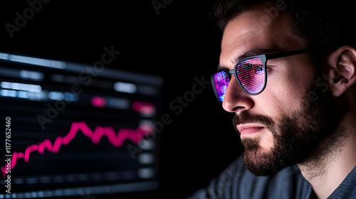 Focused man analyzing financial data at night, stock market graph visible, potential use for finance or technology