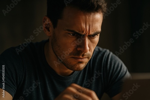 Focused man engaged in intense work at his desk during evening hours in a dimly lit room