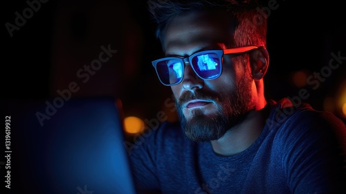 Focused Man in Blue Light Glasses Using Laptop in Dark Room for Nighttime Work