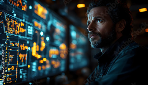 Focused man observing glowing digital screens