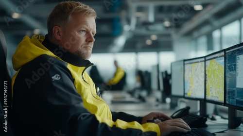 Focused man studying geographic information on multiple computer screens in a well-lit office, utilizing digital tools and analyzing maps for strategic insights