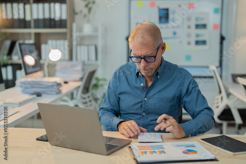 Focused mature entrepreneur working with charts and using calculator while sitting at workplace with laptop in modern office