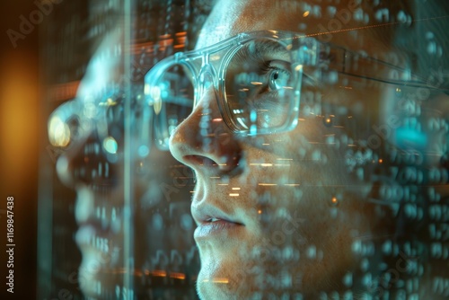 Focused programmer reviewing code on a large screen. Intense concentration, late night work.