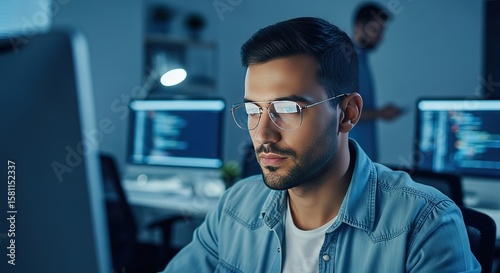 Focused programmer wearing glasses intently working on a computer screen in a dimly lit office environment